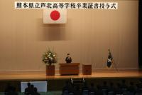 卒業生を代表して、元生徒会長の橋本くんが答辞を述べました。1年入学時から、「チャレンジ精神旺盛で負けず嫌い」な学年集団として様々な学校行事に果敢に取り組んできたエピソードや修学旅行でのスキーの思い出、また押しつぶされそうな思いに圧倒されながらも被災を乗り越え最後の野球部の試合に臨めた軌跡が語られました。また、3年間支えてくれた先生方への感謝とともに、在校生へ創立百周年を迎える芦北高校での学びの大切さが伝えられました。