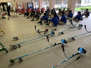 左がラジコンで動く草刈り機、操作方法を習いながら操作している生徒の様子です。