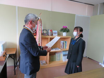 一般財団法人熊本公徳会の事務局長 甲斐壮一様が来校され、公徳文芸賞短歌の部で最優秀賞を受賞した3年農業科 濵田智恵さんに賞状・盾・記念品の授与が行われました