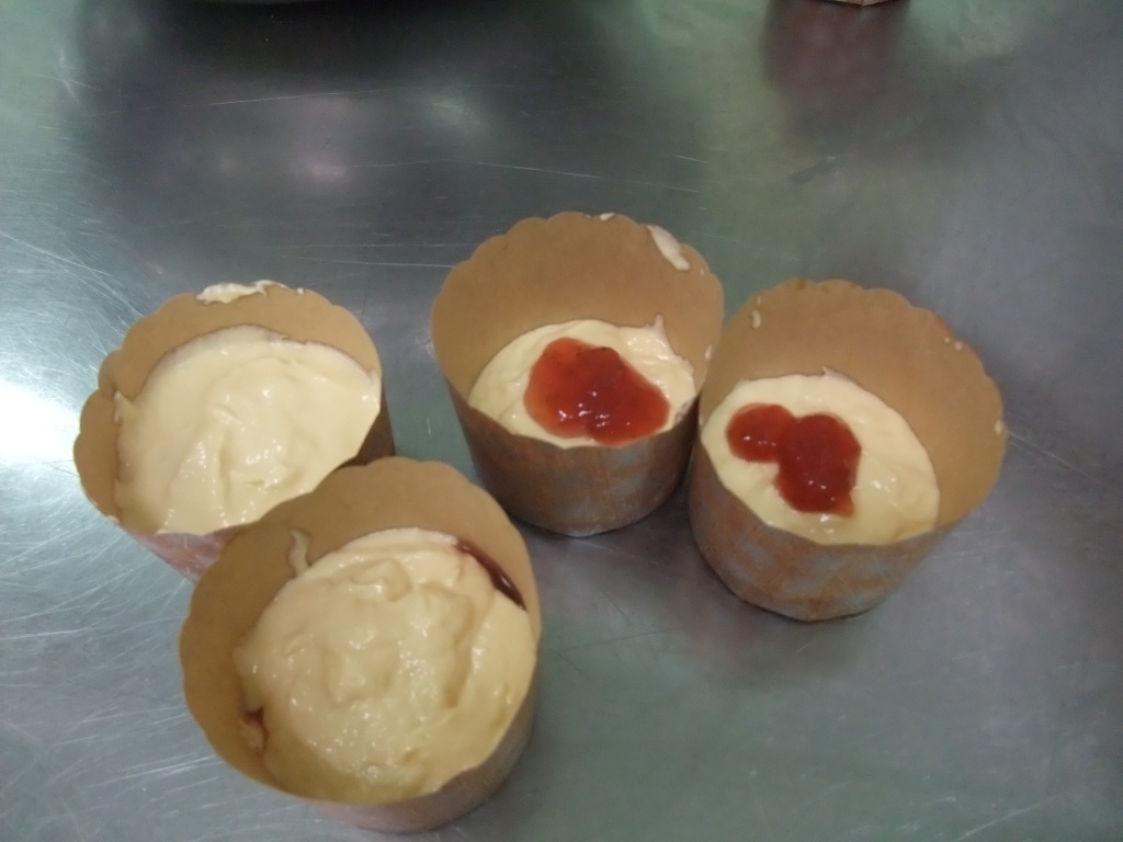 (マフィンの真ん中にいちごジャムがくるようにいれましょう。もちろん!いちごジャムは