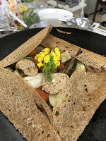 本場のガレットは専用の丸い鉄板で焼きますが、家庭でも気軽にできるようにと今回はフライパンで作りました。芦北の食材をふんだんに使って吉田さんが調理されたサラダやドレッシング、エビ、里芋のオーブン焼き、デコポンや甘夏のシラップ漬けなどをガレット生地に盛り付けて試食しました。