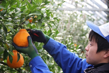 農業科3年の果樹専攻生は、1年間かけて栽培した不知火に鋏を入れて収穫をしました。