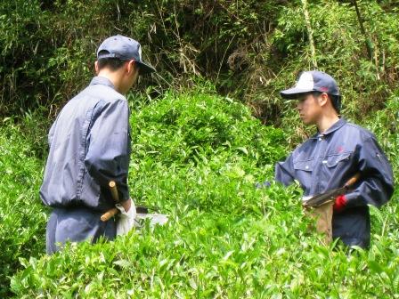 『夏も近づく八十八夜、野にも山にも若葉が茂る・・・』という歌があるように、この時期は全国で茶摘が行われています。農業科では毎年この時期に1年生から3年生の全員で茶摘みを実施しています。
