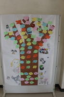 書道の作品や、各クラスオリジナルの壁新聞、色紙やイラストなどがならび、支援学校さんもレインボーカラーのオリジナル手形の展示を行なっていただきました。