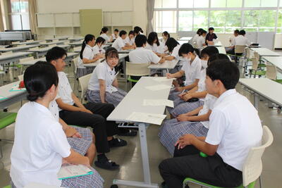 7月19日(水)から8日間、1年・2年福祉科の生徒たちは介護実習を行います。実習に先立ち、2年生が1年生に昨年度の介護実習の様子をスライドにまとめ、発表しました。発表の内容は施設の理念、職員構成、行事、仕事内容など、非常に多岐にわたる充実したものでした。初めての実習を迎える1年生は懸命にメモを取りながら発表に聞き入っていました。