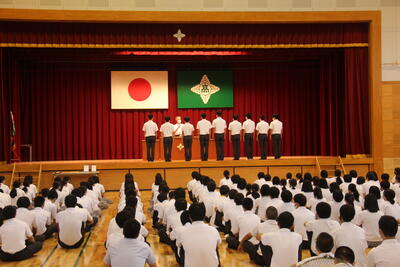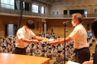 表彰式では、九州大会や全国大会へ出場を決めた部活動(相撲部、空手部、新体操部)や、農業クラブや林業科での取り組みで表彰をうけたプロジェクトグループが登壇しました。