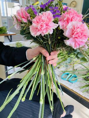 組む花束に1.2年生は苦戦