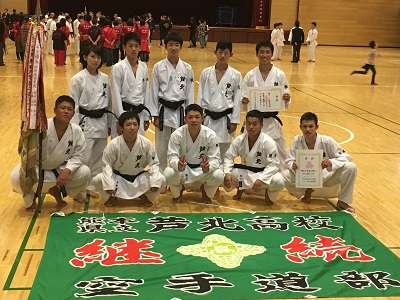 10月14日・15日に熊本県高等学校空手道新人大会が熊本市の文徳高校で開催されました。昨年、男子団体組手で優勝した芦北高校は連覇をかけて大会に臨みました。前回優勝校という追われる立場でありましたが、そのプレッシャーをはねのけて、優勝することができました。