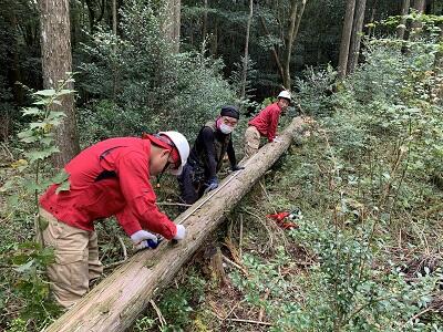 伐採が終ったら、枝を払って、長さをそろえます。今回は、実際に販売するので4m10cmに印付けし、玉切りしていきました。丸太が大きいので荷重がどのようになっているのかを確認しながら慎重に切っていきます。