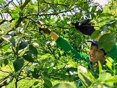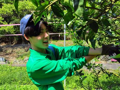 慣れない手つきで甘夏の剪定に挑む2年生たち。