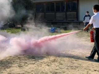今回は、消火剤が出る消火器を使うため、実際の炎を消すようです。