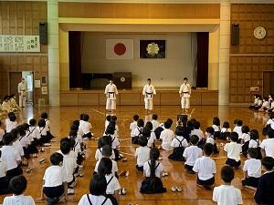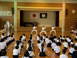 芦北町は、「空手道」に力を入れています。今日は、湯浦小学校で「空手道から何を学ぶのか」という講演会がありました。その中で空手道部の団体形を披露しました。体育館の空気は一瞬に変わり、児童達は真剣に見てくれました。感想では、「すごい迫力だった」「キビキビ動いてかっこよかった」などの言葉がありました。
