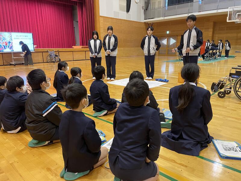 小学校では、総合的な学習の時間において「福祉」を学んでいます。その一環として、福祉を学ぶ高校生が先生役となってと小学生が交流しながら福祉について学ぶ機会を頂きました。
