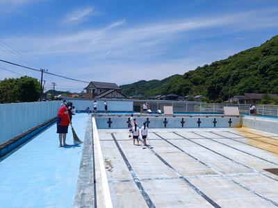 今日は1年生の体育の授業でプール掃除です。使わない期間に葉っぱや鳥の巣の後?蜘蛛の巣やG…などなど。