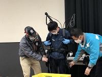 ますは「パワーアシストスーツ」です。収穫したものを運搬するときにアシストしてくれるスーツです。スーツを装着して手に付いているフックでコンテナ(約20kg)を持ちます。そして持ち上げると楽~に持ち上がり、ビックリしました