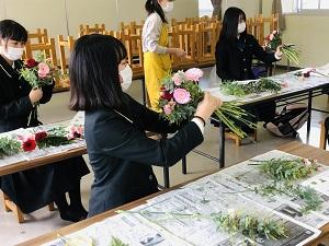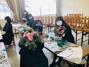 農業科による第3回フラワーアレンジメント講習が行われました。今回は「ブーケ」の作成です。スパイラルの技術が難しかったですが、生徒の個性が光るかわいいブーケを作ることができました!