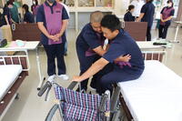 大堀先生は「動き出しは本人から。介護者がすべてやろうとせず、利用者様の自主性やできることを認めることが大切である」と話され、生徒は体位変換や車いす移乗の支援を実践しました。