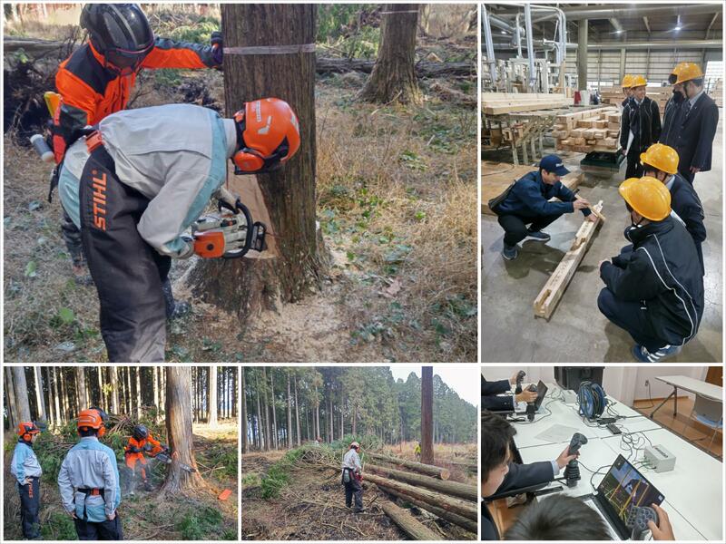 12月10日に林業の視察体験研修が行われ、1Gと2Gが参加しました。学年ごとにマイクロバスで移動し、1Gは阿蘇森林組合蘇陽加工所(山都町)の製材工場などの見学を行いました。2Gは協同組合熊本ランベックスでプレカット工場の見学や熊本県林業研究・研修センターで高性能林業機械操作シュミレータ体験などを行いました。