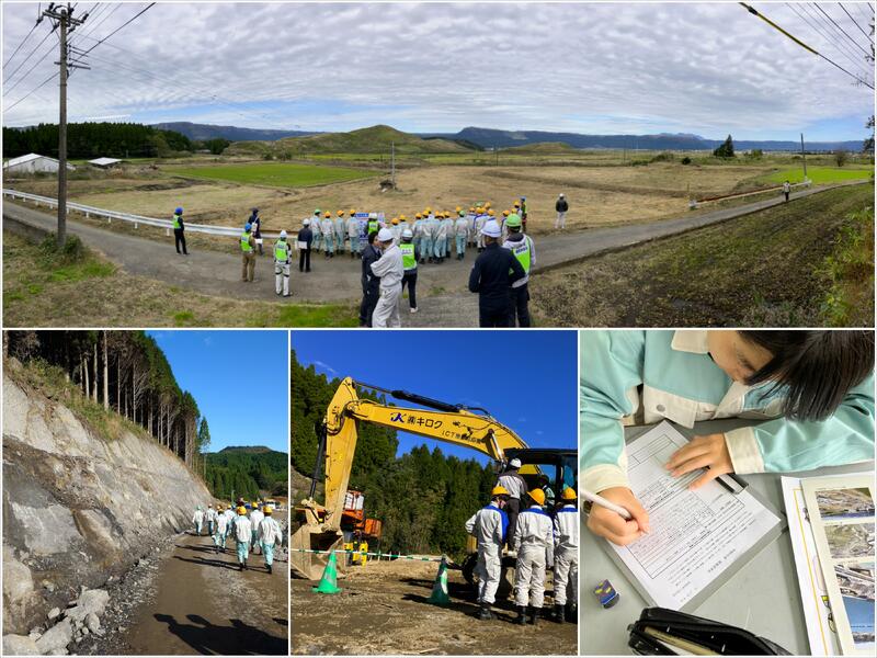 この見学会は阿蘇地区建設業協会青年部との連携授業で、阿蘇地域振興局や各現場の建設企業にもご協力を頂き、工事関係者しか入れない現場で「見て・歩いて・聞いて・触れて」記憶に残る見学会となりました。
