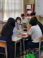相互鑑賞会。 お互いに作品を紹介し合いながら、制作の際に工夫したことを述べたり、感想を言い合ったりして意見交換をします。 |