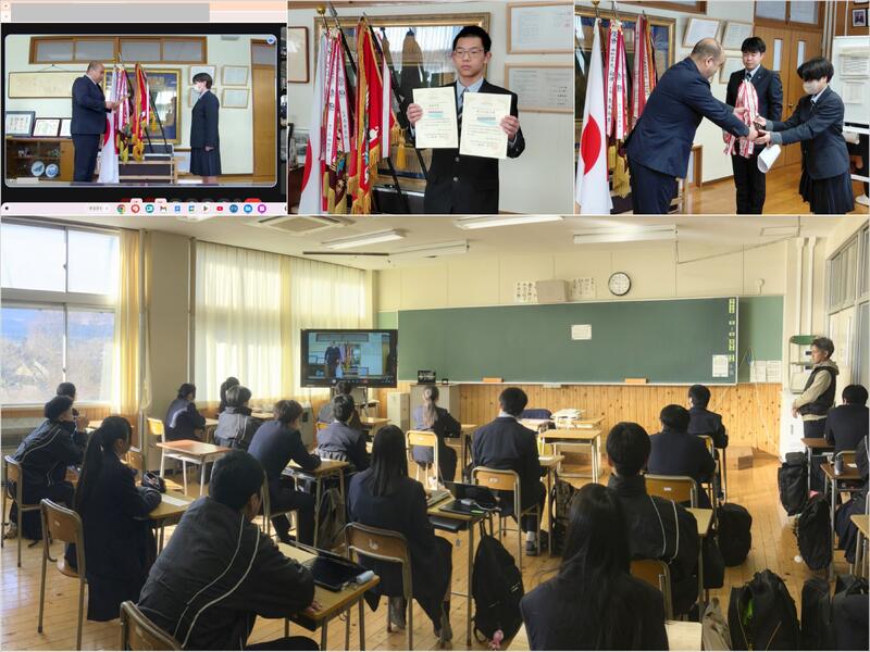 始業式前には阿蘇校舎生徒の表彰が行われ、梶原校長先生より賞状や盾・トロフィーが手渡されました。表彰された生徒の皆さん、おめでとうございます。