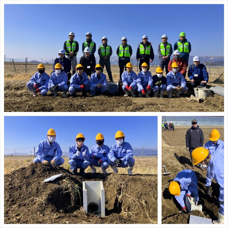 その準備として、緑と水の科学科1年生8名が2月3日(火)3、4限目に、阿蘇地域振興局様と阿蘇建設業協会青年部様のご指導のもと、本校1号田に「機能分離型排水桝」と2号田に「通常の排水桝」を設置しました。