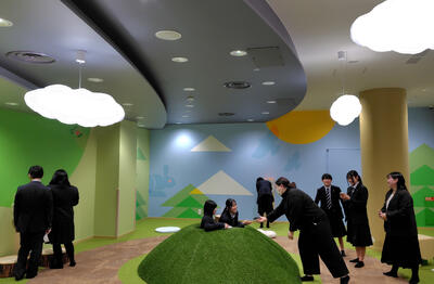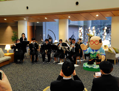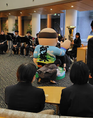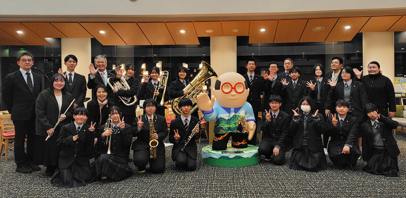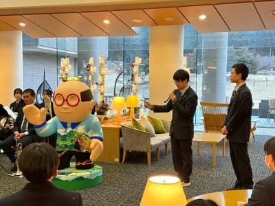 本校の美術部にも亀の井ホテル様より依頼があり、阿蘇の魅力を込めたデザインを考え、1ヶ月間かけて彩色を行いました。この像の背中には、阿蘇の文字があり、書道部が揮毫を行いました。また、お披露目会では吹奏楽部による演奏をバックに式典を盛り上げました。芸術の3つの部活動で合同で取り組むイベントは無いので、力を合わせた貴重な経験となりました。お披露目会は宿泊のお客様も訪れ、賑わいました。この熊八像は亀の井ホテル阿蘇のロビーに設置されています。もし、ホテルにお寄りの際は、ぜひ見ていただけたらと思います。