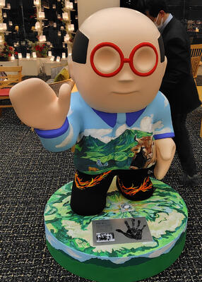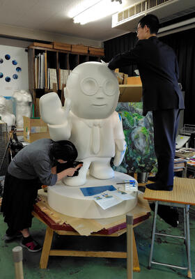 ホテルのある地元の高校生に依頼し、亀の井ホテルの創始者油屋熊八をデフォルメした像に地域特色を込めたデザインを考え、彩色し、亀の井ホテルに設置するというものです。