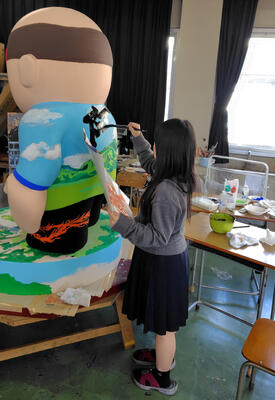 | 初めはこんなに真っ白。しかも、なかなか大きいです。 | アクリル絵の具を使って1、2年生で彩色を施しました。 | 書道部に「阿蘇」の文字を揮毫しました。 | いよいよ除幕式。喜んでもらえるかな。 |