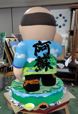 デザインは正面は雄大にそびえる「阿蘇五岳」 を背景に阿蘇を代表するの「あか牛」と美しい 「オオルリシジミ」を服に描いています。 ズボンには阿蘇の風物詩「火振り神事」の闇に 火の輪が舞う様子を描いています。 背には「草千里」を背景に書道部が揮毫した「阿蘇」の文字を背負っています。 台座は世界自然遺産であるカルデラを上から見た姿 を描いています。 |