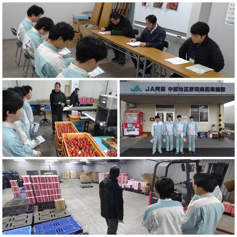 12月12日(金)、農業食品科3年野菜専攻生が、JA阿蘇中部野菜センターを訪問しました。阿蘇のイチゴの生産状況や栽培について教えていただき、イチゴの選果の様子を見学しながら野菜の流通について学びました。