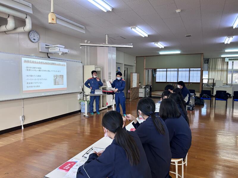 さらに捻挫、骨折、やけどをした傷病者の対応や傷病者を危険な場所から移動させる運び方なども学び、生徒たちも真剣に話を聞き、実践に活かしていました。