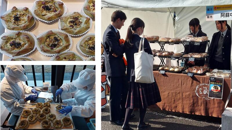 農業食品科(食品科学類型)3年では、”玄米ペースト”パンの製品開発に取り組んできました。そこで、12/20(土)にグランメッセ熊本で開催された「第4回県立学校学びの祭典」において、玄氣堂さんに生徒のアイデアを製品化していただき販売しました。当日の朝、玄氣堂さんの店舗に出向いて包装などを行い販売に臨みました。サツマイモで異なる食感の2種類の具材を詰めた”人生いもいも”パンは、あっと言う間に50個が完売しました。生徒たちは、再現されたパンのクオリティーの高さに驚きながらも、うれしそうに接客していました。