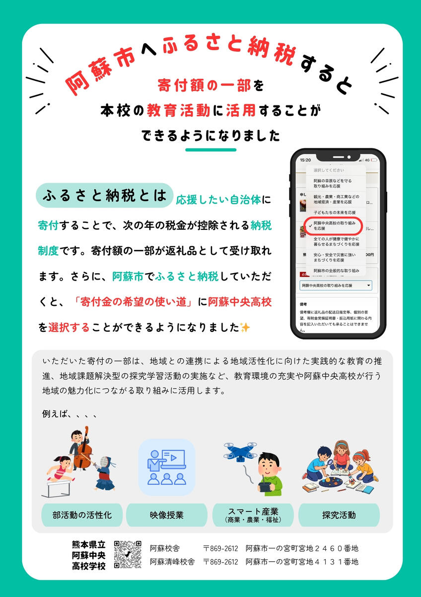 熊本県教育情報システム 登録機関 管理責任者 校長 梶原 哲運用担当者 教務部 ▼阿蘇校舎〒869-2612熊本県阿蘇市一の宮町宮地2460番地TEL 0967-22-0070FAX 0967-22-4142 ▼阿蘇清峰校舎〒869-2612熊本県阿蘇市一の宮町宮地4131番地TEL 0967-22-0045FAX 0967-22-5161 ▼E-maila