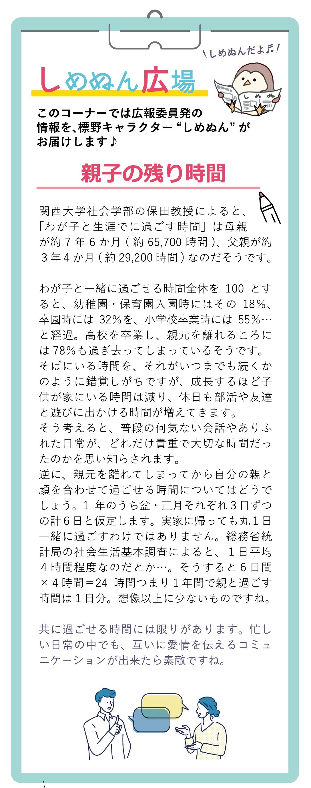 《しめぬんの広場》を紙面に新設しました。このコーナーでは広報委員発の情報を掲載していきます。