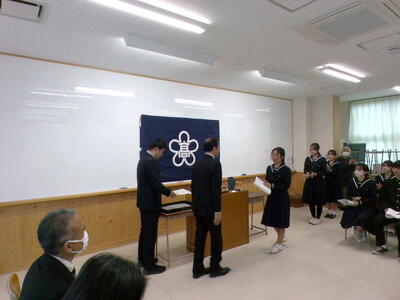 12月2日(火)校長室にて熊本西税務署より来校いただき、令和7年度「高校生税の作文」表彰式が実施されました。本校では1年生2名が、熊本西税務署長賞および熊本西税務署管内青色申告会連合会会長賞をそれぞれ受賞し、署長様直々に賞状と記念品を授与していただきました。2人とも税と自分たちの生活についてしっかりと考察した作文が評価されたことを喜ぶとともに、今後も、世の中の出来事に対して興味関心を広げていこうという気持ちをあらたにもつことができました。