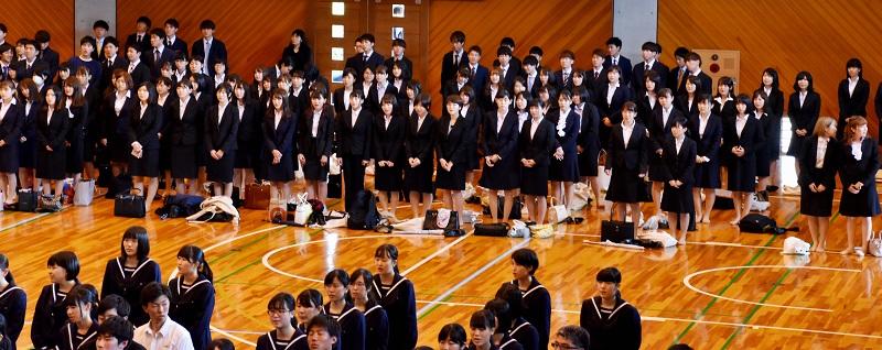 音楽部部長の指揮による校歌斉唱や生徒会保健委員会環境係のペットボトルのふた回収運動結果報告、進路指導主事の講話等があり、校内合唱コンクール最優秀賞の1年7組と2年1組の合唱が披露されました。