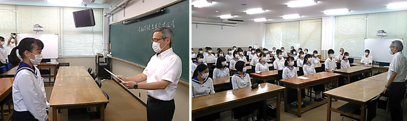 一年間歌うことができなかった、本校自慢の校歌の合唱で先生方をお送りしました。