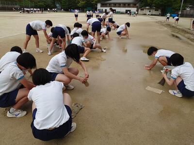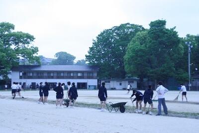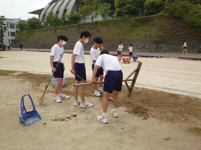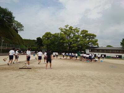 朝まで降った雨で、グラウンドに水たまりができています。運動部活動の2,3年生たちが明日の体育部門の本番に向けて、水抜きをしています。