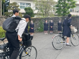 新たな年度を迎え、生徒会役員による「朝のあいさつ運動」を4月13日(水)に行いました。生徒会役員は登校してくる校友と元気なあいさつを交わし、自転車の二重ロックを呼びかけました。