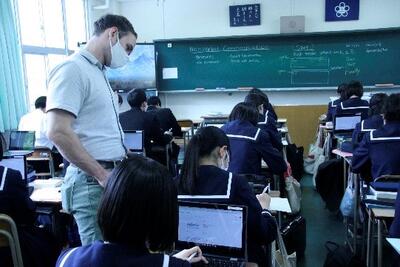 Bridge Kumamotoの佐藤さんと坂本さんのお二人が、本校2度目の来校で、2年生の生徒達のプロジェクトの悩み相談とアドバイスをされました。最初にMeetを使って各教室へアドバイスを行い、その後教室を巡って、班ごとに声かけをされました。
