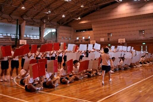 1年生は体育館で集団行動の練習です。