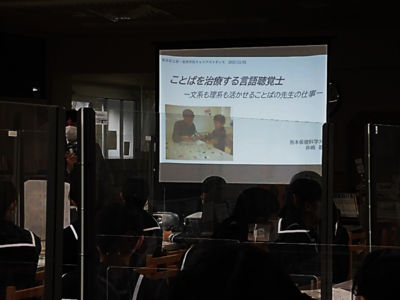 失語症の方(大人)の訓練の様子や、発達障害の子どもの会話訓練の様子など動画を交えながら分かりやすく紹介してくださいました。そのような動画や先生のお話を通じて、受講した生徒からは「一人ひとりの障害や症状に応じて訓練方法を変え、その結果、患者さんだけでなく患者さんをサポートする家族など周囲の人へのサポートにもなっていると思いました。」といった感想が寄せられました。また、今回は先生に加えて現在、言語聴覚学専攻4年生の本校卒業生の先輩からもお話を伺いました。先輩が言語聴覚士を目指したきっかけを話されているときの参加者の真剣なまなざしが大変印象的でした。