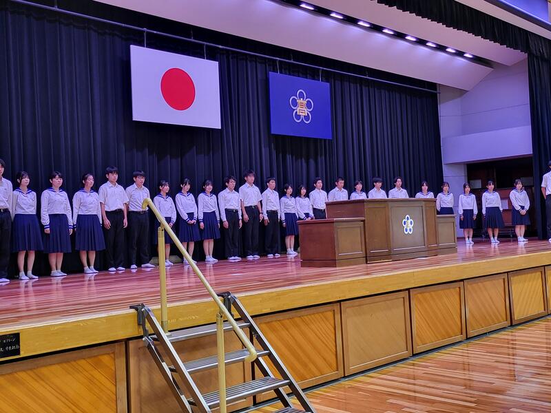 始業式の中川泰校長の訓話では、「さまざまなテクノロジーがコンバージェンス(融合)によって指数関数的に急激に進化する時代を、逞しさとしなやかさを持って生き抜いて欲しい。」というメッセージがありました。その後、音楽部長の指揮の下全校生徒で校歌を斉唱しました。