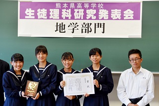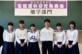 【地学部】今年度の研究成果 投稿日時 : 2018/12/12 学校サイト管理者 今年度の地学部は2年生が「熊本地震の被害3~熊本市の被害と水前寺断層との関係~」、1年生が「火星の南極冠の縮小2018」をテーマに研究を進めてきました。その成果を熊本県スーパーハイスクール指定校合同研究発表会等で発表しました。その結果、以下の受賞となりました。また、本校は熊本県科学展で通算25回目の入賞となり、学校賞を受賞しました。