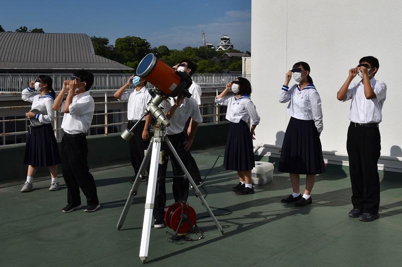 夏至の6月21日16:00~18:12、部分日食が雲の切れ間から観察できました。地学部でも屋上で日食グラスや望遠鏡を使って観察と撮影を行いました。熊本で観察できる次の日食は2030年6月1日で、部分日食となります。