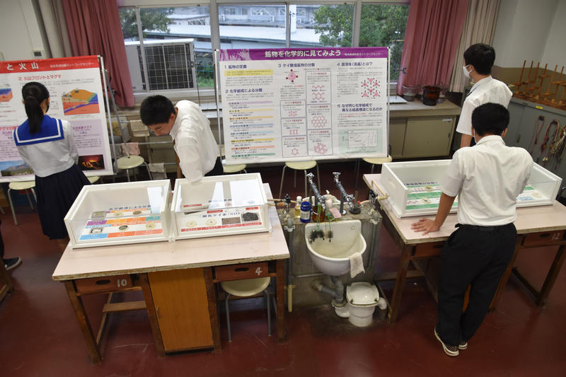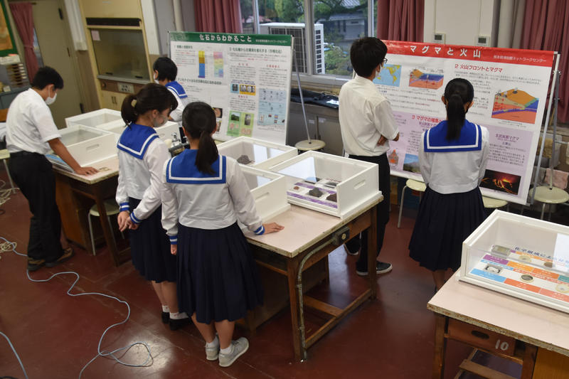 一高祭文化部門展示発表で地学部は、熊本県博物館ネットワークセンターの学校移動展示用パッケージの「化石からわかること」や「マグマと火山」、「鉱物を化学的に見てみよう」の展示を行っています。