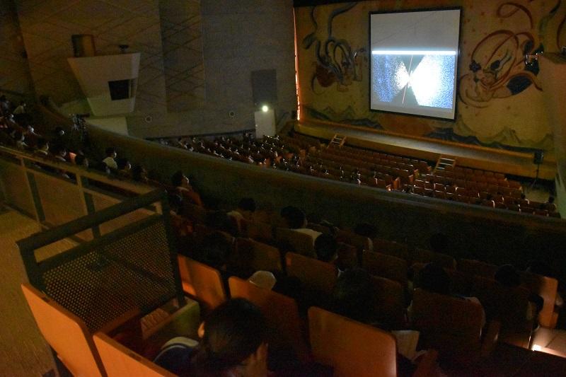 一高祭文化部門で地学部は、熊本市民会館ステージ上の大スクリーンにプラネタリウム(Mitaka)を投影しました。Mitakaは国立天文台が開発した、天文学の様々な観測データや理論的モデルを見るためのソフトウェアです。地球から宇宙の大規模構造までを自由に移動して、宇宙の様々な構造や天体の位置を見ることができます。