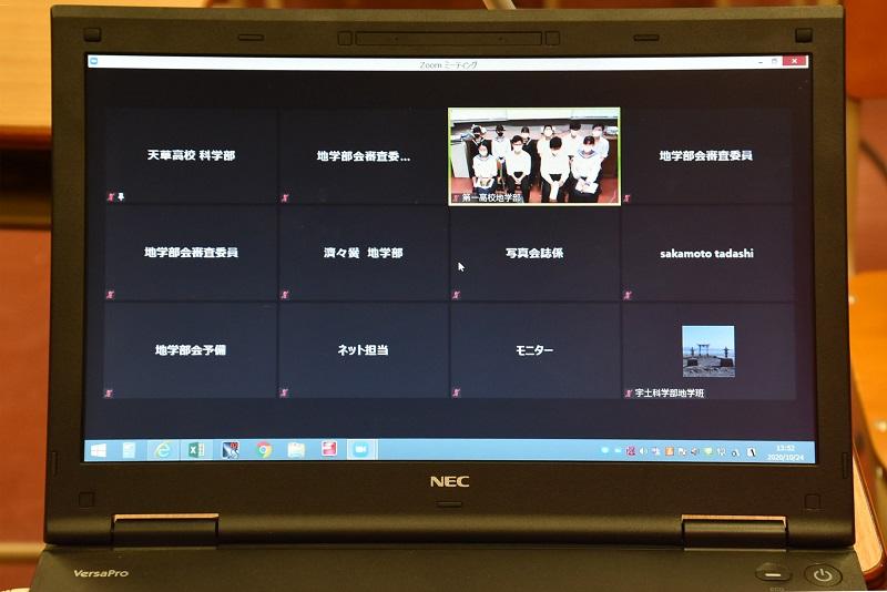 10月24日(土)に第71回熊本県高等学校生徒理科研究発表会が開催されました。今年は新型コロナウィルス感染拡大防止のため、リモートで開催されました。各校の研究発表はあらかじめ自校で動画撮影してYouTubeにアップロードし、発表会当日に参加各校は自校でYouTubeにUPされた各校のプレゼンテーションを視聴します。質疑応答は審査会場の審査員から、各校で待機する参加者にZoomを使って行われ、審査となりました。地学部門では7校から11件の発表があり、コロナ渦でも県内地学関係の部活動では活発に研究が行われています。