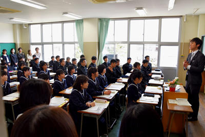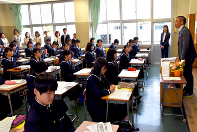 音楽部の宮崎部長指揮による第一高校の象徴ともいえる校歌合唱で先生方を歓迎しました。